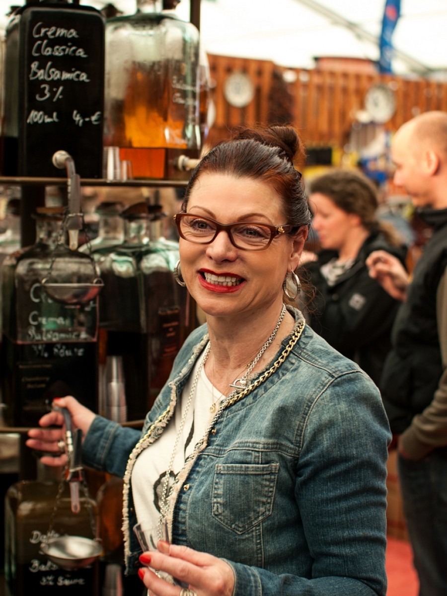 Da sind auch die Verkäuferinnen und Verkäufer, die Promoter, die Marktschreier. Sie wollen mit vollen Auftragsbüchern nach Hause gehen oder einen guten Umsatz gemacht haben. Das sind die Protagonisten auf der anderen Seite, die im Extremfall an 11 Tagen den ganzen Tag vor Ort sind. 350000 Besucher und mehr flanieren an den Messetagen an ihnen vorbei. Wenn sie müde sind, ruhen sie aus, verpflegen sich. Die Verkäuferinnen und Verkäufer sind auch müde, haben Hunger und Durst. Sie können nicht weg, Das ist ihr Los. So der Senior, der am Wein-Stand die Erzeugnisse aus Mallorca, mehr als Urlaubsinsel bekannt, anbietet. Oder am Nachbar-Stand die Promoterin, die einen Zauberstab praktisch erklärt.