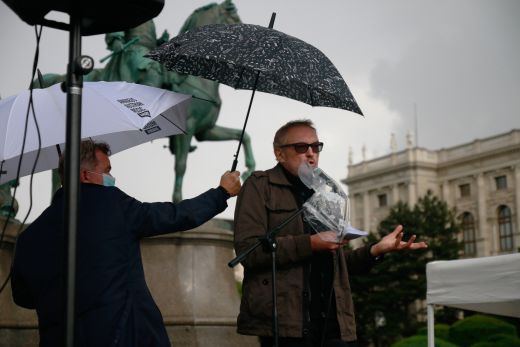 aten statt Worte. KünstlerInnen können von Ankündigungen alleine nicht leben. Viele KünstlerInnen sind in eine Notlage geraten und können sich ihre Miete und ihr Essen nicht mehr leisten. Deshalb forderten zahlreiche Besucher und Künstler bei der Demo vor Ort, ein Bedingungsloses Grundeinkommen, sowie die Soforthilfe aller Kunst und Kulturschaffenden in Österreich. Die soziale Lage der Kunstschaffenden war schon vor der Krise vielfach bestürzend und Corona hat dies noch verschärft. Als Redner auf der Bühne sprachen u.a Schauspieler und Kabarettist Josef Hader, Kabarettistin Guggi Hofbauer, Andrea Eckert (Schauspielerin / Intendantin). Mit dem Auftritt des Roma-Musikers Harri Stojka, endete die Kundgebung.
