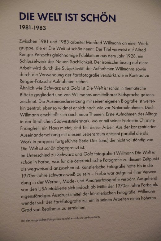 Seine zahlreichen Fotos, zeigen Szenen aus seinem persönlichen Umfeld in Graz und der Südsteiermark. Umfangreiche Serien, darunter die einflussreichen Arbeiten „Schwarz und Gold“ und „Das Land“ sind in der Ausstellung zu sehen. Heute den 7.2 2019, wurde die Ausstellung im Beisein des Künstlers und im Rahmen eines Vortrages feierlich eröffnet. Für die musikalische Untermalung sorgten die Oberösterreichische Band Attwenger, die Lieder in Mühlviertler Mundart zum Besten gaben. Die Ausstellung kann von 8. Februar bis 26. Mai 2019 im Wiener Albertina Museum, besucht werden. https://www.albertina.at/ausstellungen/manfred-willmann/