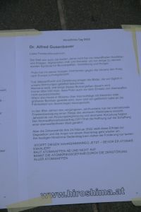 Diverse interessante Reden waren zu hören, wie etwa von Alois Reisenbichler zum Thema Atomstrom, (der seit Jahren aktiv im Wiener Friedensbüro mitarbeitet, und diesen Event mitgestaltet).