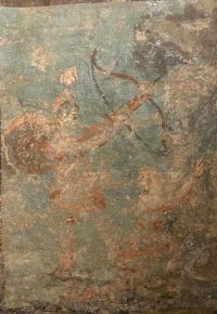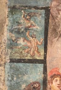Das Mithräum in der Stadt Marino (Rom).Wand mit Tauroktonie-Fresko im Mithräum