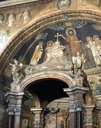 Die Kirche S. Prassede in Rom birgt die beachtenswerteste Gruppe römischer Mosaiken des 9. Jh. Die Kirche des 5 Jh. Ist der hl. Praxedis geweiht. Über dem Triumphbogen ist das Himmliche Jerusalem dargestellt, dessen Mauern und edelsteinglänzende Tore Erzengel beschützen. In einer Nische ein 1223 beim Kreuzzeug Kaiser Friedrich II. von Kardinal Colonna nach Rom gebrachtes Säulenfragment, das von der Geiβelsäule Christi stammen soll.