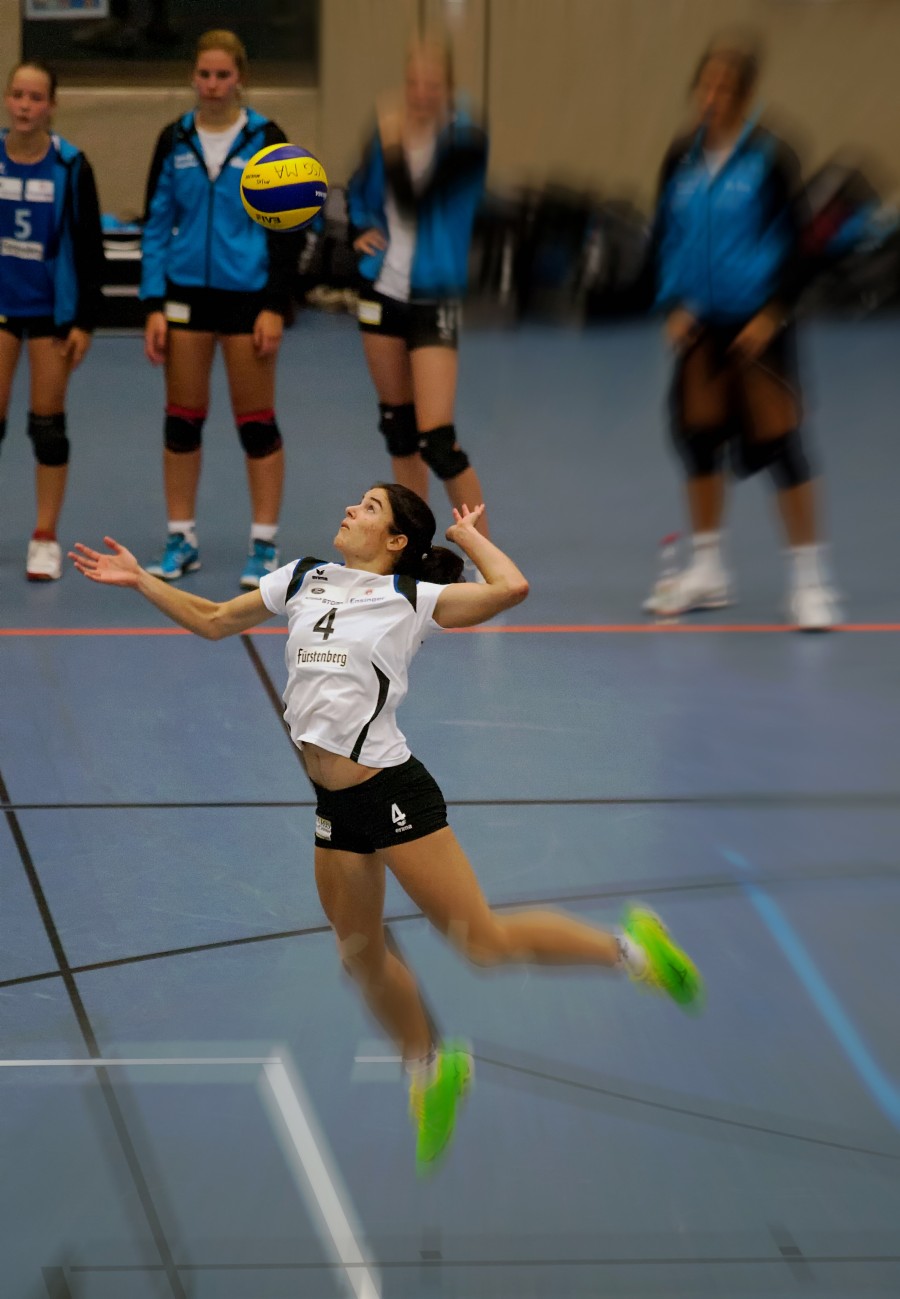 Draußen ist wunderbares Wetter. Schöne, angenehme Temperaturen und die Sonne strahlt vom Himmel. Für den Fotografen gar nicht optimal. Die Sonne wirft Schatten, auch in den Gesichtern der Spieler. Der Kontrast in den Fotos ist zu stark. Natürlich verträgt die Kamera jetzt Verschlusszeiten von 1/1000 und kürzer. Die passenden Blendenwerte sind aufgrund des verfügbaren Lichtes klein. Damit wird das Foto durchgängig scharf. Aber ein wunderschönes Bokeh, d.h. eine Unschärfe hinter dem wichtigsten Objekt des Fotos, ist nicht möglich. Schade und nicht optimal. In der Halle steht meist nur wenig Licht zu Verfügung. Oft kommen wir sogar bei 1/500 an die Grenze. Ohne lichtstarke Objektive mit mindestens größter Blende 2,8 geht gar nichts.