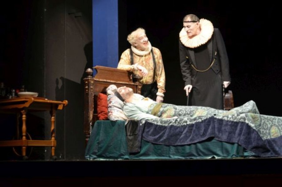 Viele Weggefährten fühlten sich angesprochen und machten Volpone mit kostbaren Geschenken ihre Aufwartung, um seiner Gunst geneigt zu bleiben. Der Kaufmann Corvino (Karsten Kramer ) warnt vor Ärzten, „weil sie manchmal doch helfen“. Die Kurtisane Canina (Franziska Troegner) beschwört Mosca, einzufädeln, dass Volpone sie noch vor seinem Ableben heiratet. Der Pfandleiher Corbaccio (Thomas Schendel) enterbt zeitweilig seinen Sohn in dem Glauben, dass er Volpone überlebt wodurch sich das Familienvermögen vermehren würde. „Der Ruhm Venedigs“, die schöne Colomba (Anja Gräfenstein), sitzt ahnungslos und mitfühlend am Bett des angeblich Sterbenden und wäre ohne die Hilfe von Capitano Leone (Jonathan Kutzner) ein Lustopfer geworden. Der Notar Voltore (Oliver Nitsche) verfasst, schreibt und siegelt das Testament umsonst. Durch den kunstvoll angelegten Handlungsverlauf und die Spielfreude der Komödianten des Schlosspark-Theaters, verführt das eigentlich dramatische Geschehen zur Heiterkeit.