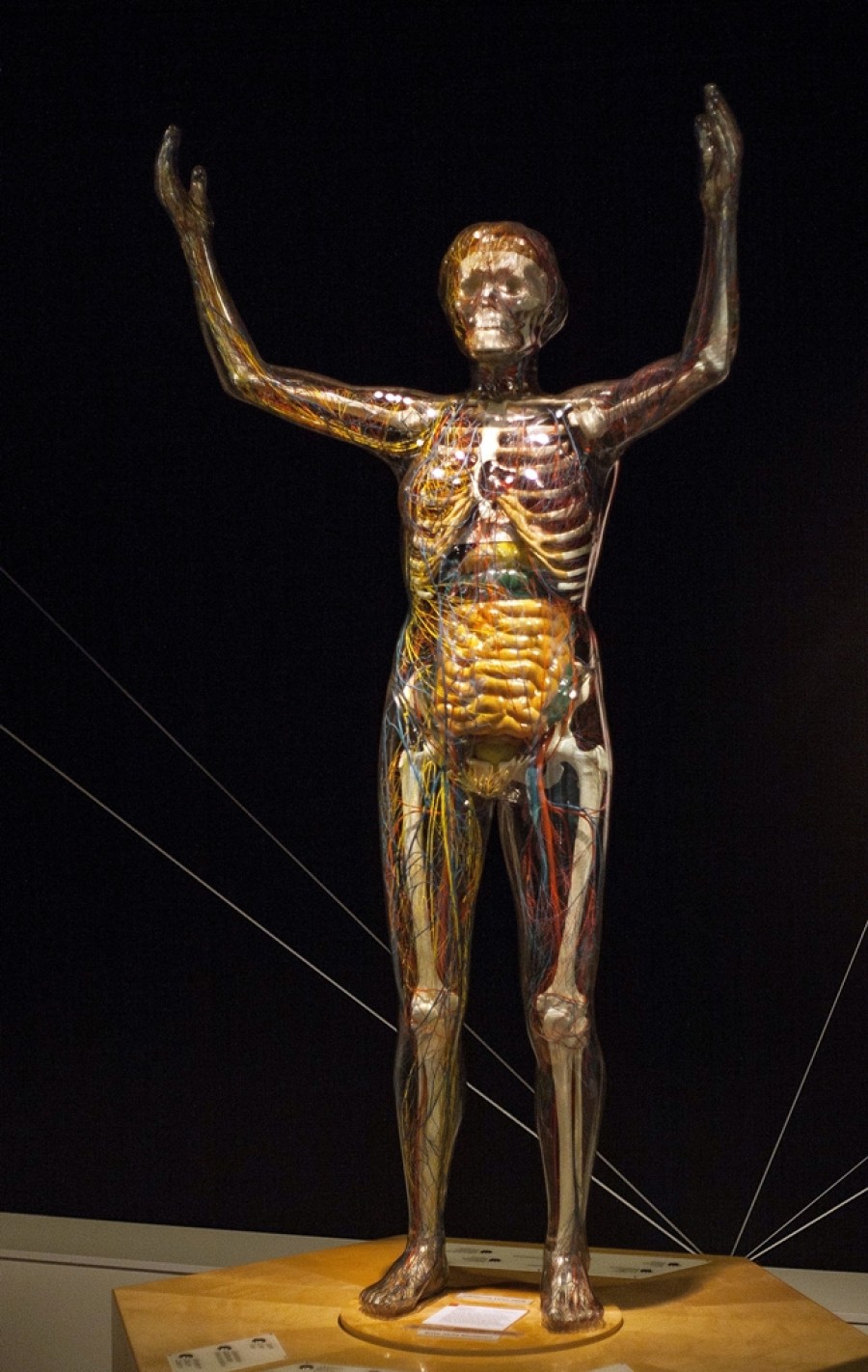 Empfangen wird man mit der dreidimensionalen Aufnahme eines schlagenden Herzens und den dazugehörigen dumpfen Herztönen. Diese Herztöne begleiten einen auch in den anderen Themenräumen der Ausstellung. Dem dumpf schlagenden Herz ist ein Plexiglastorso mit einem modernen Kunstherz gegenübergestellt. Moderne Medizin ist von Beginn an eine Symbiose von naturwissenschaftlichem Denken und dem Einsatz technischer Instrumente und Geräte. Medizinische Erfolge werden immer größer, führen aber auch zu gesellschaftlichen und ethischen Debatten. Übrigens erhielten seit 2002 mehr als 650 Menschen dieses Kunstherz und in einigen Fällen erholte sich das Herz der Patienten und eine Transplantation wurde hinfällig. Los geht der Rundgang dann in einem Anatomischen Theater, das einem frühzeitlichen medizinischen Hörsaal nachempfunden ist.