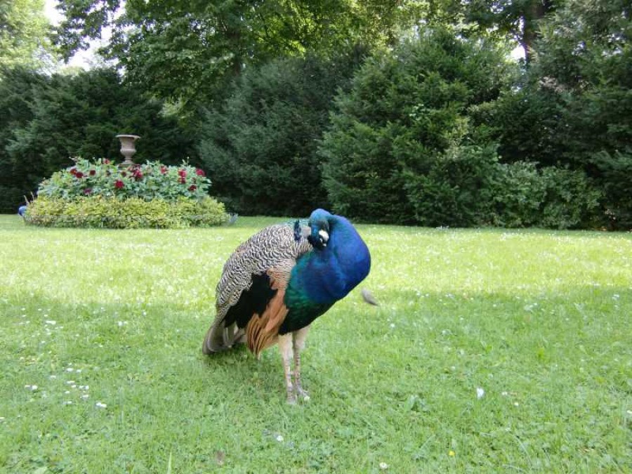 Pfauen, um die sich in den verschiedensten Epochen Legenden um Liebe, Schönheit und Unsterblichkeit rankten,wurden angekauft und in einer als Heuschober verkleideten Unterkunft untergebracht. Schon die Römer schmückten ihre Gärten gerne mit Pfauen, die ihren Balztanz mit ausgebreiteter Federkrone aufführen. In dem Werk des Dichters Saadi „Rosengarten“ aus dem 13. Jahrhundert war es nach paradiesischen Vorbild einzig der Pfauenfeder würdig, als Lesezeichen im Koran zu liegen. Nach dem Tode König Friedrich Wilhelms II. (1797) - ein Jahr zuvor hatte er seine Gefährtin zur Gräfin von Lichtenau erhoben - wurde gegen Wilhelmine wegen Hochverrat ermittelt. Unschuldig in Festungshaft genommen wurde ihr Vermögen konfisziert und sie selbst für einige Zeit aus Berlin verbannt. Verbunden mit führenden Gelehrten und Künstlern war sie eine einflussreiche Mäzenin des preußischen Frühklassizismus. Ihr Berliner Haus gehörte zu den führenden Salons der Stadt.