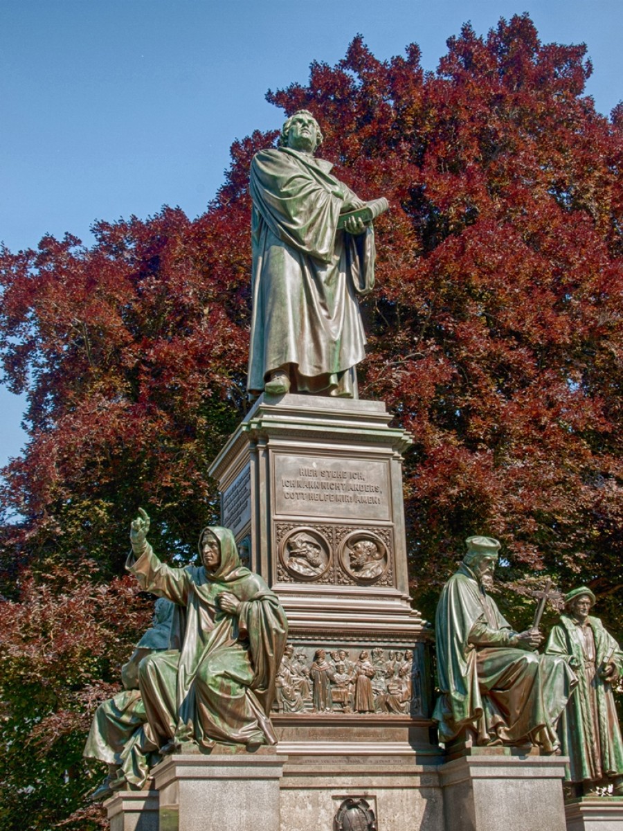 "Daher kann und will ich nichts widerrufen, weil wider das Gewissen etwas zu tun weder sicher noch heilsam ist, Gott helfe mir, Amen,." antwortete Luther in seiner Verteidigungsrede auf dem Wormser Reichstag 1521. Nicht sicher belegt ist der Ausspruch : " Hier steh ich, Gott helfe mir. Ich kann nicht anders:" Der schon vorher mit Kirchenbann belegte Luther sollte auf Frage von Karl V. zu seinen in Büchern geäußerten Ansichten Stellung nehmen. Luther widerrief nicht. Das führte zur Verabschiedung des Wormser Edikts und der Verhängung der Reichsacht über Luther. Das Reformationsdenkmal wenige Meter vom Heylsgarten auf dem Lutherplatz erinnert an die standhafte Haltung Luthers. Zu Füssen Luthers sitzen seine Mitstreiter für die Kirchenrefom.