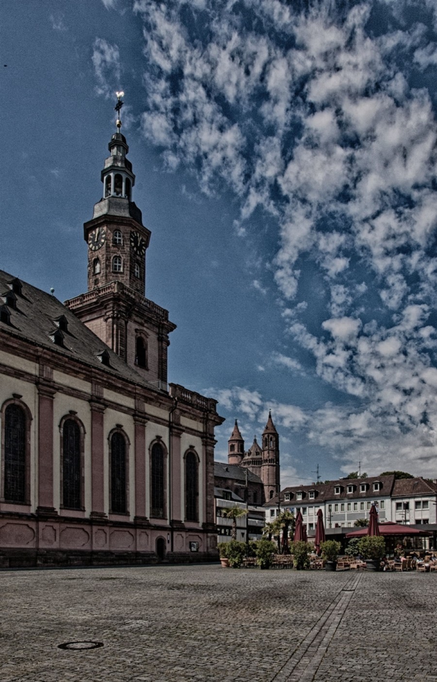 Das 1958 erbaute Rathaus und die barocke Dreifaltigkeitskirche beherrschen den Wormser Marktplatz. Im Hintergrund erkennt man die Türme des Doms St. Peter.Vor dem Rathaus steht der Gerechtigkeitsbrunnen. Justitia schmückt den Brunnen über Neptun und Herkules. Die Dreifaltigkeitskirche entstand zwischen 1709 und 1725 dort, wo das alte Rathaus stand. Im Pfälzischen Erbfolgekrieg und dem verheerenden Stadtbrand waren das alte Rathaus, Kirchen und Klöster ein Raub der Flammen. Die Dreifaltigkeitskirche erinnert an den Ort, an dem Martin Luther den Widerruf seiner Thesen verweigerte. Die alte Kirche bot im Innern 3000 Kirchenbesuchern Platz. Die Kirche hatte eine vollkommen ausgemalte Decke mit dreiseitig umlaufenden Galerien, Nach dem Brand wurde das Innere der Kirche 1945 im Stil der 50-er Jahre gestaltet.