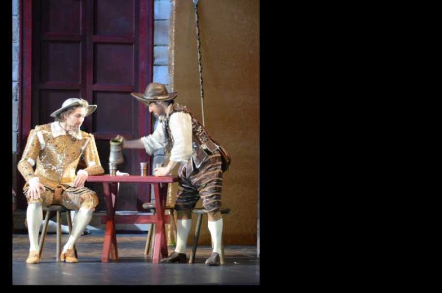 Er sattelt sein bereits in die Jahre gekommenen Pferd. Und als er es auf den Namen Rosinante umtauft, scheinen dessen Hufe beim Jagd-Galopp den Boden nicht mehr zu berühren. Zusammen mit dem pragmatischen Sancho Pancho, dem ersten Schildknappen auf einem Esel, macht er sich auf den Weg. Die Kette ihrer gemeinsamen Abenteuer scheint endlos und lässt aus Weggefährten Freunde werden. In einem seiner spektakulären Abenteuer versetzt Don Quixote den vom Magier Malfente verzauberten Weinschläuchen unzählige Hiebe, um - den Edelmut des Rittertums bewahrend - Dorothea, eine vermeintliche Prinzessin, vor einem Lüstling zu beschützen. Als das Gewölbe mit Wein überschwemmt wird, ergrimmt der Wirt, da es zum Privileg des Rittertums gehört, auch ohne Bezahlung abzureisen. Die possenhaften Inszenierungen seiner heimlichen Mitreisenden sollen Don Quixote zu ihrer eigenen Belustigung, solange täuschen, bis seine Abenteuerlust ermüdet.
