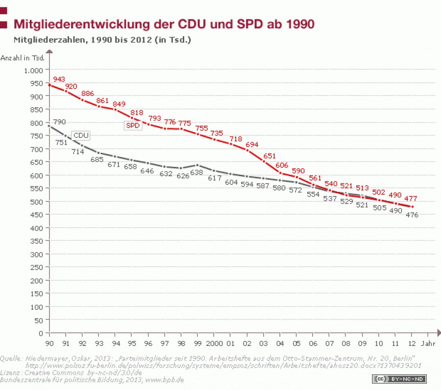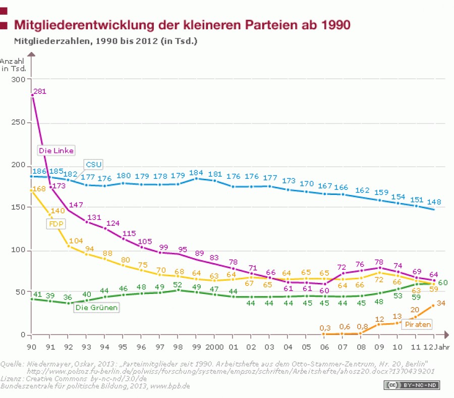 Es wird die großen Parteien nicht wirklich trösten, dass alle im Bundestag vertretenen Parteien bis auf die Grünen 2012 Mitgliederverluste hinnehmen mussten. Den stärksten Mitgliederverlust hatte 2012 die Linke, doch auch die FDP verließen scharenweise die Mitglieder. Diese Entwicklung ist bedauerlich und beunruhigend zugleich. Und es kommt bei den Parteien auch nicht so recht eine Schadenfreude über die Mitgliederverluste der Konkurrenz auf. Erinnert sei in diesem Zusammenhang auf die Bedeutung der Parteien, die die Mütter und Väter des Grundgesetzes so formuliert haben::„(1) Die Parteien sind ein verfassungsrechtlich notwendiger Bestandteil der freiheitlichen demokratischen Grundordnung. Sie erfüllen mit ihrer freien, dauernden Mitwirkung an der politischen Willensbildung des Volkes eine ihnen nach dem Grundgesetz obliegende und von ihm verbürgte öffentliche Aufgabe.“
